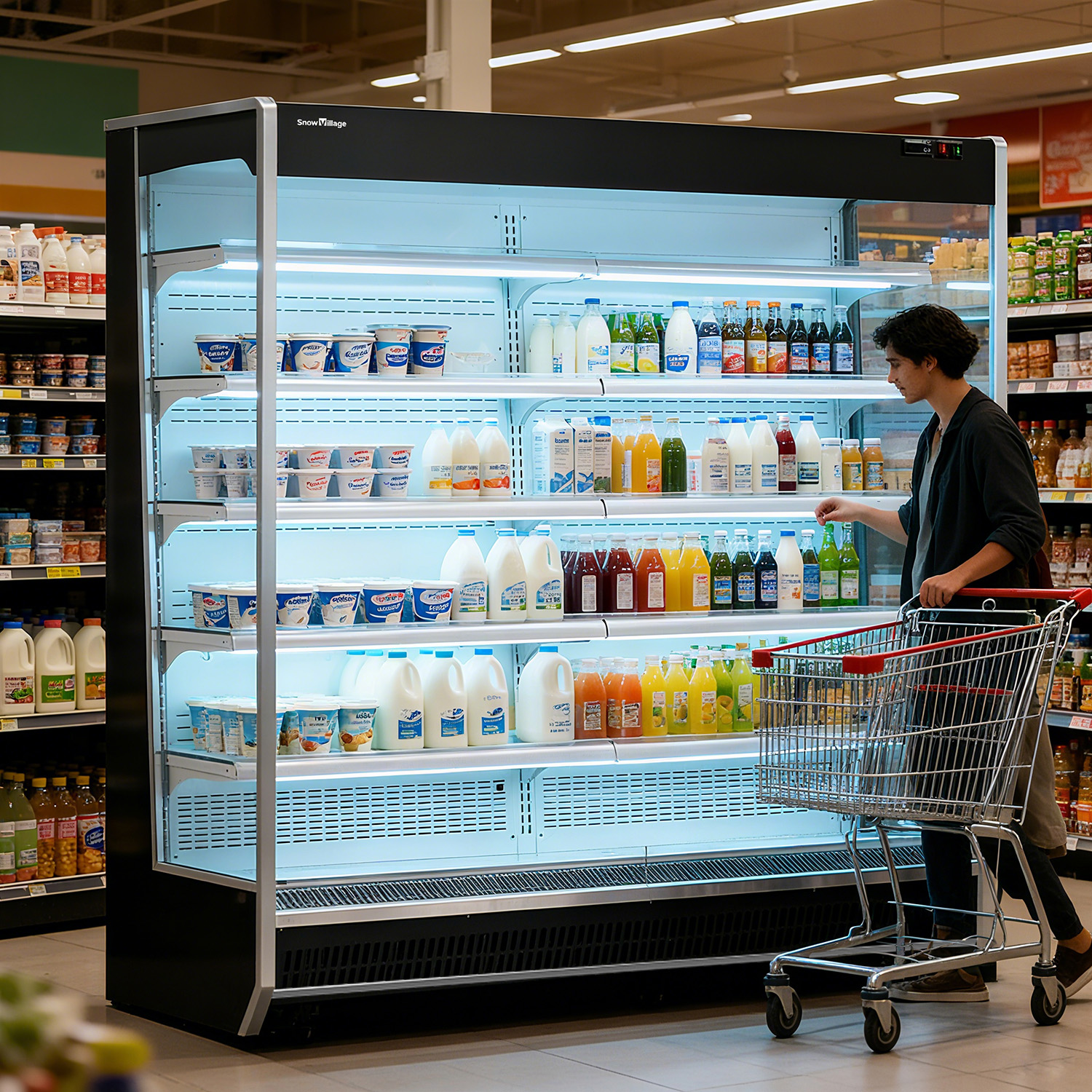 This refrigerated display cabinet is applicable to scenarios including large supermarkets, supermarket convenience stores, and farmers' markets. It is used for refrigerating and displaying items such as beverages, milk, and alcoholic drinks.